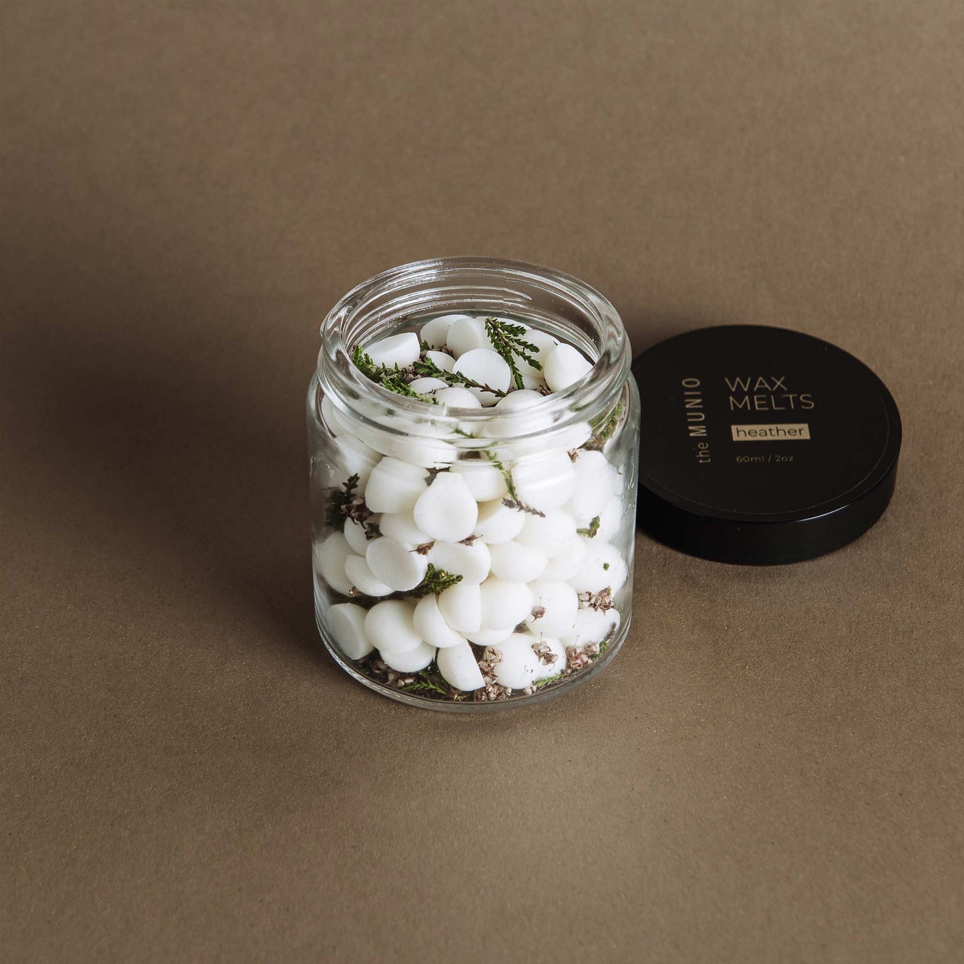 The Munio Heather wax melts naturally freshen your space with a sweet floral fragrance, offering a beautiful and sustainable way to add long-lasting scent to drawers, closets, or rooms—with the option of a more intense aroma in a wax warmer.