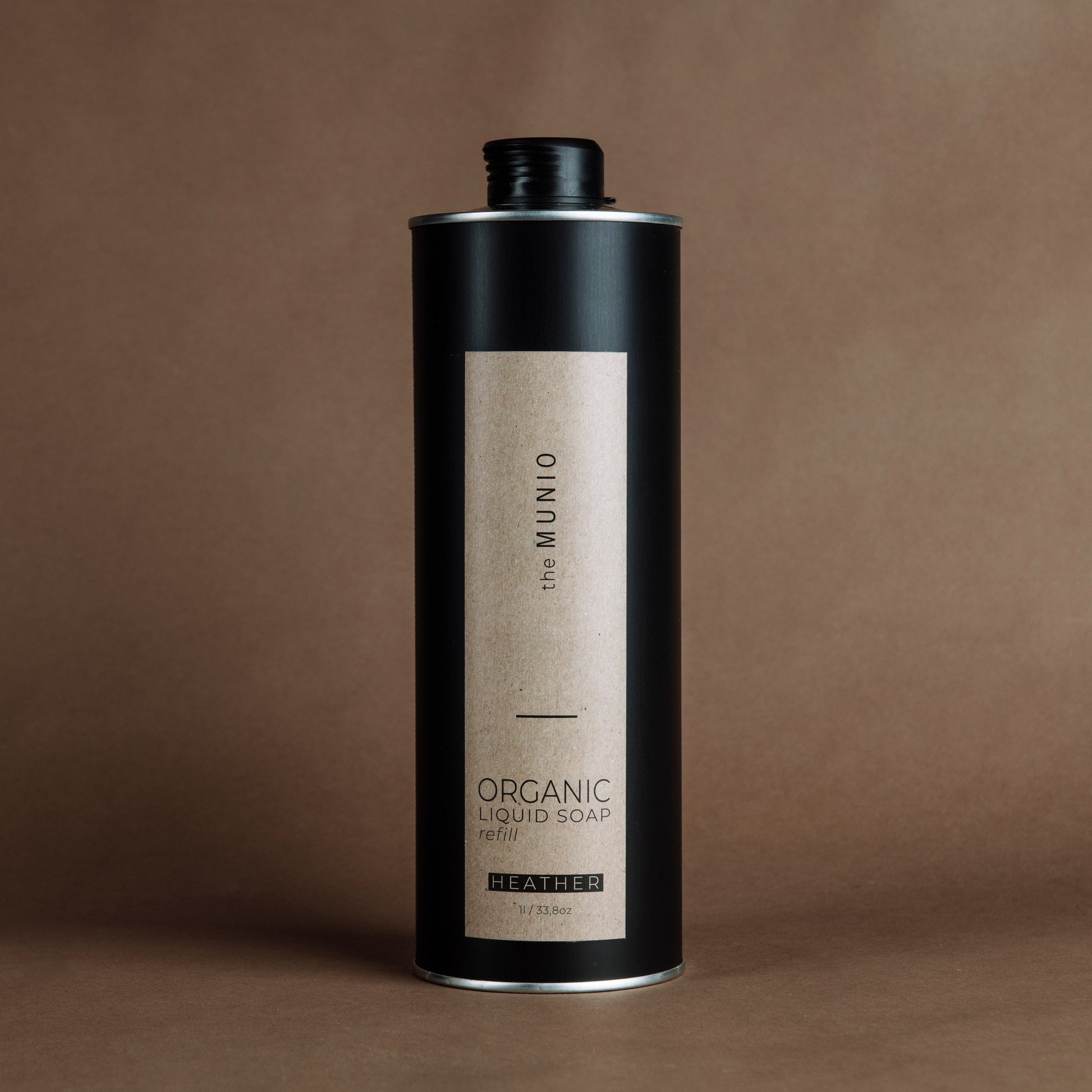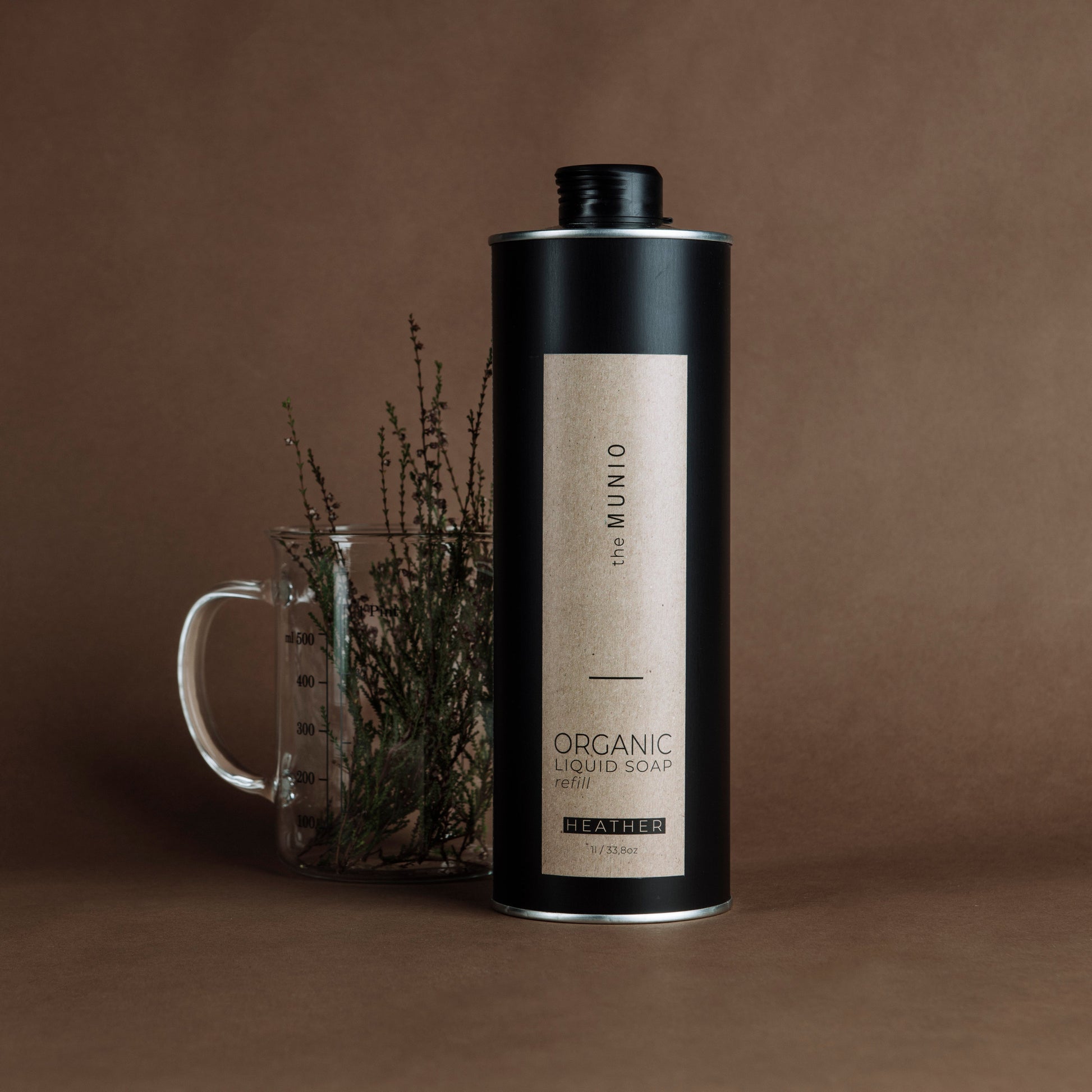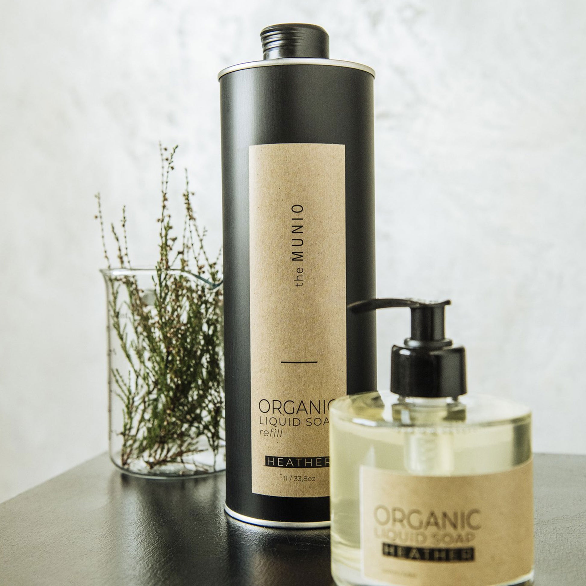 Gently foaming liquid soap made from organic coconut and sunflower oils. Hand poured in metal bottle and fragranced with natural heather fragrance. Refill the MUNIO liquid soap 200ml glass bottle 5 times.