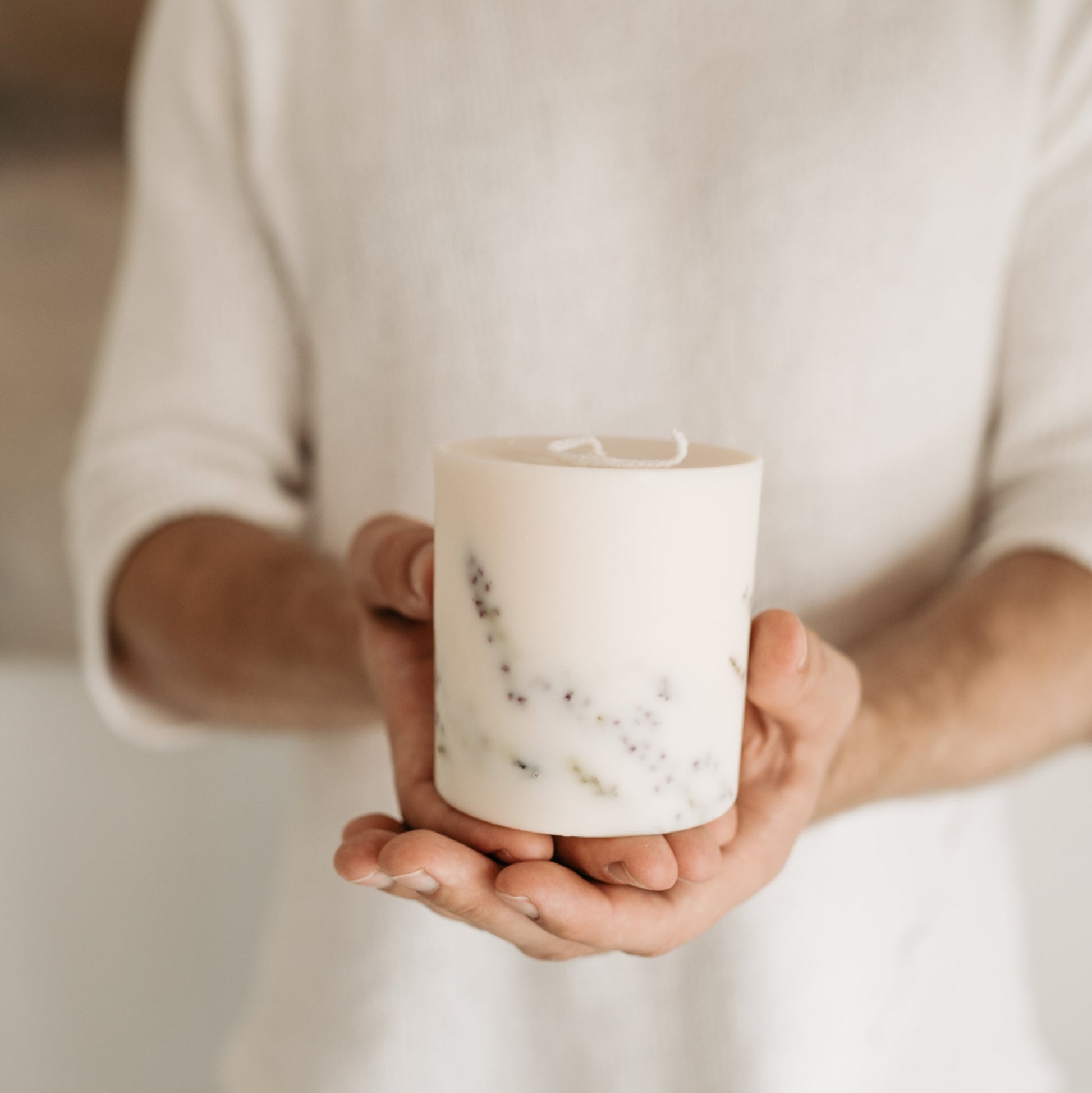 Hand-poured from a blend of soy and rapeseed wax, this botanical pillar candle is infused with a sweet heather fragrance and decorated with heather flowers from the forest. As it burns in a tunnel, the soft glow illuminates the flowers within, creating a stunning, nature-inspired centerpiece and a warm, uplifting atmosphere.