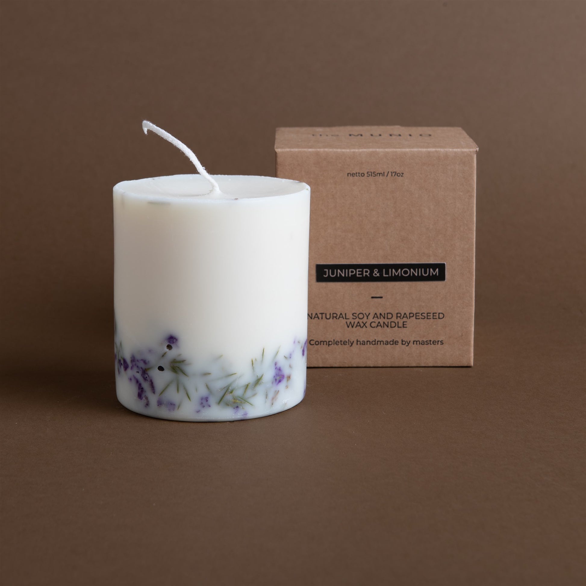 Soy wax, rapeseed wax, juniper fragrance, cotton wick, juniper twigs and limonium flowers.