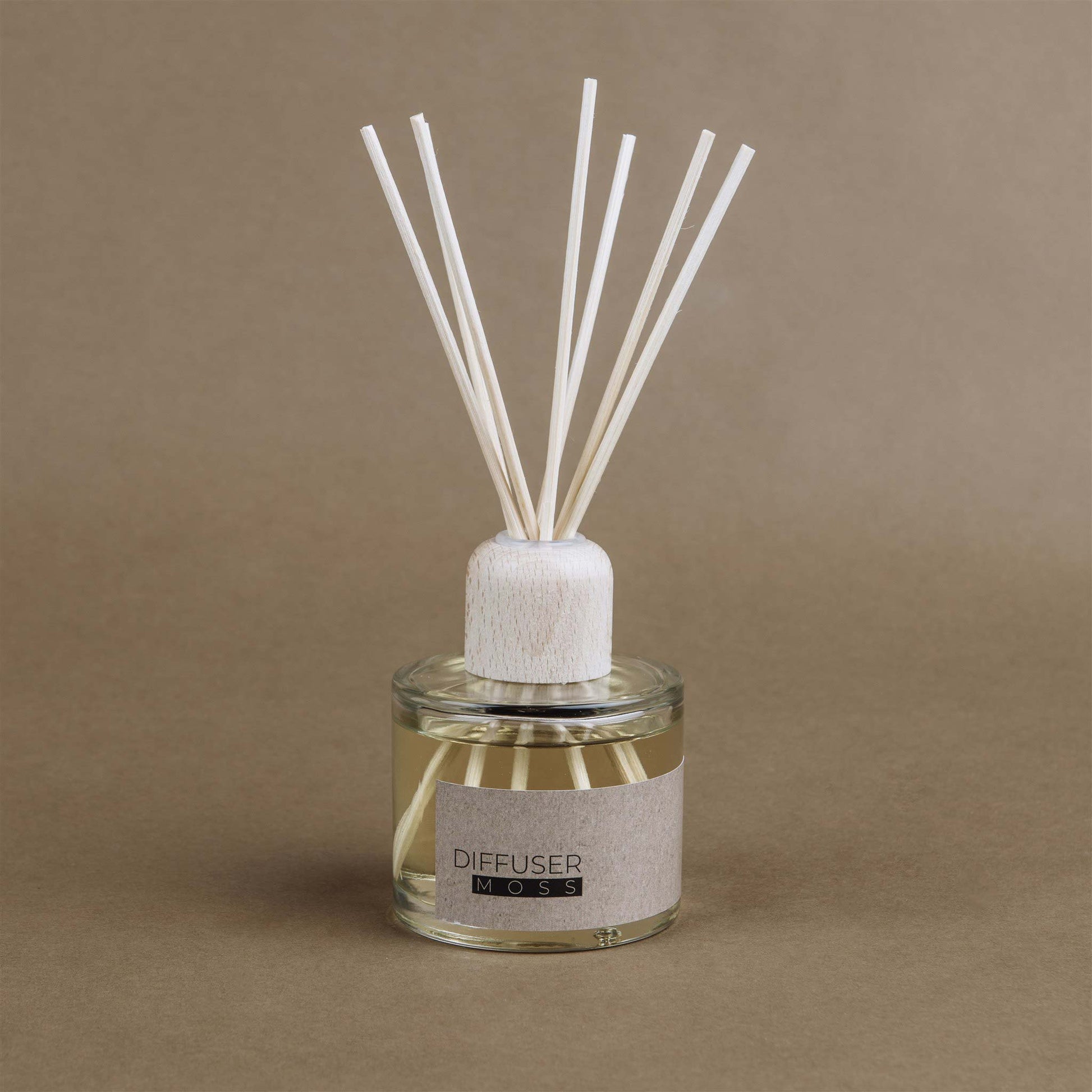 Moss fragrance, glycerin-derived diffuser base, glass bottles and 7 natural rattan sticks.